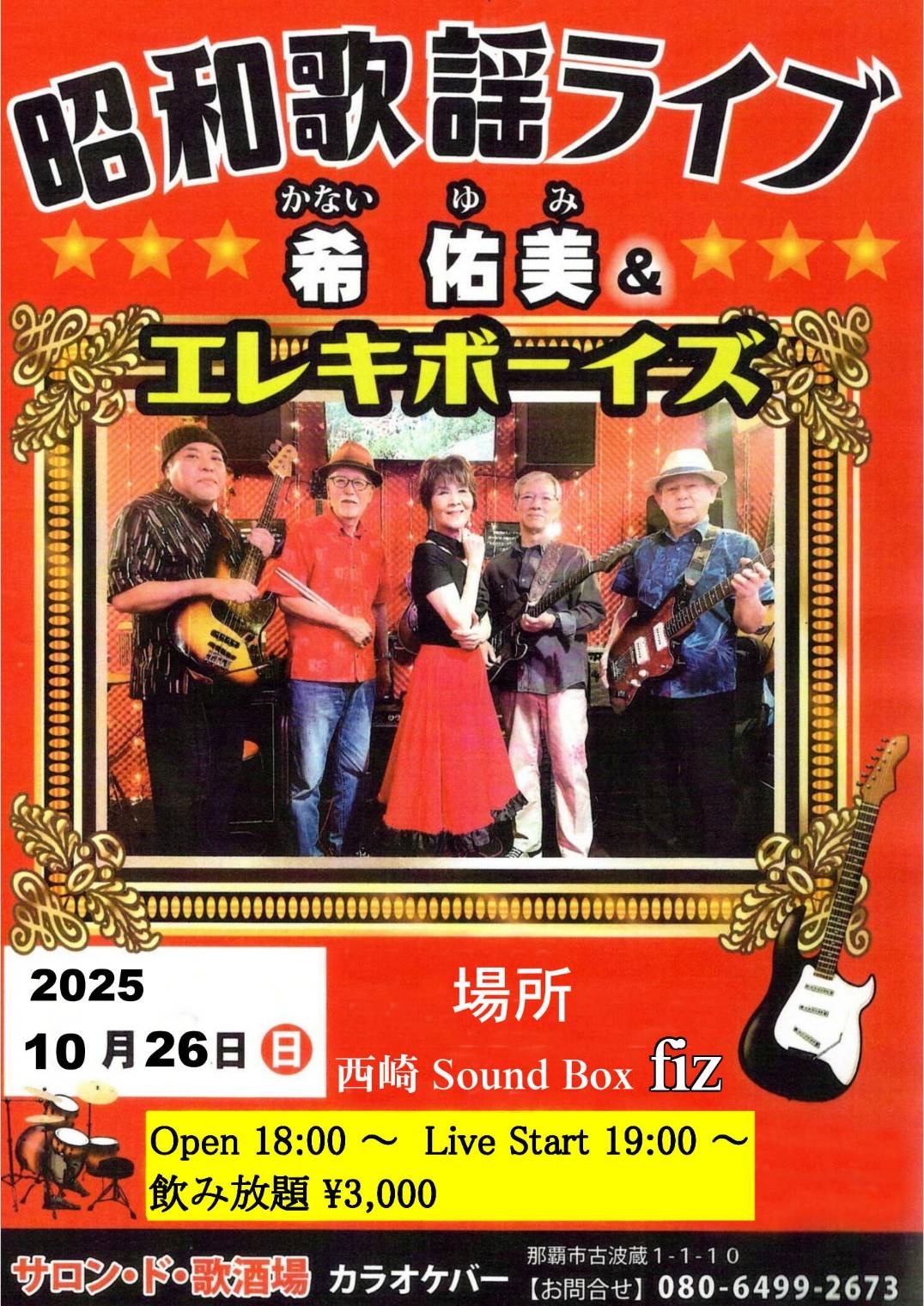 ユミ&エレキボーイズ 2025年10月1日 最終更新日時 : 2025年10月7日 Sound Box fiz Sound Box fizで2025年度から不定期で活動中のユミ&エレキボーイズ昭和歌謡 Member■Voユミさん■Guitarまもるさん■Side Guitar宮城さん■Bassおさむさん■Drumsゆうじさん